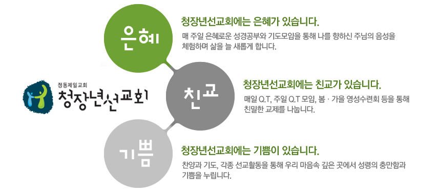 Á¤µ¿Á¦Àϱ³È¸ ûÀå³â¼±±³È¸´Â 30,40´ë°¡ ÁÖÃàÀÌ µÇ¾î ¸»¾¸°ú ±âµµ, Âù¾çÀ» ÅëÇØ ÁÖ´Ô ¾È¿¡¼ Çϳª µÇ´Â ¸ðÀÓÀ¸·Î 100¿© ¸íÀÇ È¸¿øÀÌ È°µ¿Çϰí ÀÖ½À´Ï´Ù.